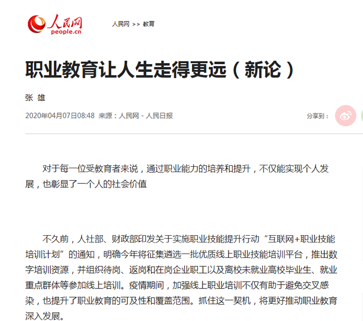 4月7日,人民网教育频道发表了一篇题为《职业教育让人生走得更远》的文章。