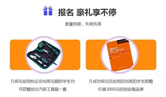 二、 凡报名抢到校企定向班名额的学生均可获赠世达汽保工具箱一套,以及价值3000元的创业精品课