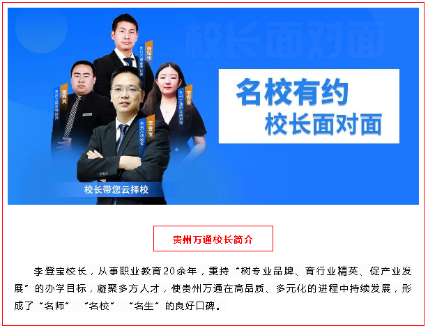 直播当日,李校长将会带来的汽车后市场资讯,通过校园参观深入解读贵州万通教学模式及设备、名师力量、就业服务、职素教育等,解析、评估和定位职业教育的美好前景。