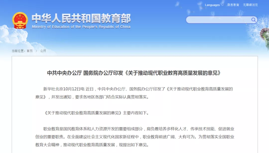 2021年10月12日,中共中央办公厅、国务院办公厅印发了《关于推动现代职业教育高质量发展的意见》,并发出通知,要求各地区各部门结合实际认真贯彻落实。